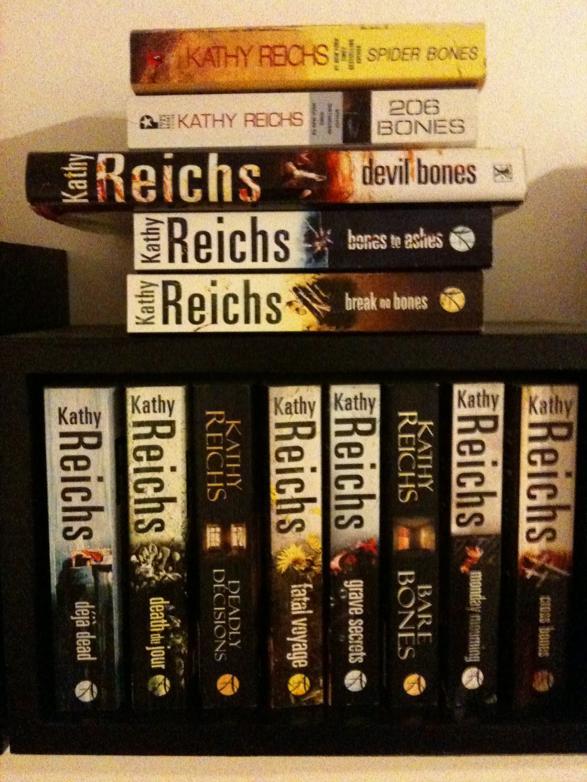Entretanto tive curiosidade para ver uma série na TV, não porque era policial mas porque tinha o Angel da Buffy, que nos meus sonhos não era da Buffy era meu, mas isso agora não interessa para história - Ossos - que nome baril para uma série! Daí até descobrir a autora da série e perceber que tinha sido baseada (muito pouco, diga-se) em livros que já existiam desde o fim dos anos 90 foi um instante. A senhora Kathy Reichs é espectacular. A personagem, Temperance Brennan, é baseada na vida dela, que efectivamente trabalha como antropologista forense, no Québec, Canadá e Charlotte, USA por isso a parte da ciência forense que aparece nos livros é super precisa e exacta. Para além disso a Temperance já não é nenhuma miúda, é divorciada, com uma filha crescida, tem um gato mas partilha um cão com o ex-marido e uma catatua com o namorado, enquanto vive entre o Canadá e os EUA. São boas histórias muitas baseadas em casos reais e embora não estejam "na moda" nunca desiludem. Há anos que não vejo a série mas há sempre um livro dos Ossos primeiro na minha “Wish list”, depois na minha mesa de cabeceira e depois na minha "estante".